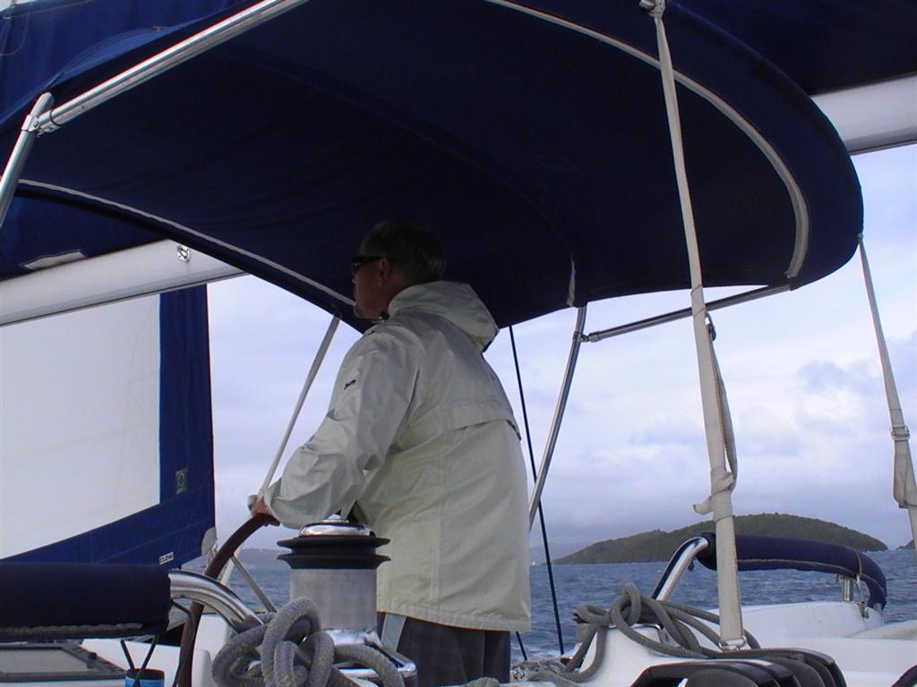 We woke up to rain in a small cove off Buck Island. Missy made some breakfast sandwiches of fried eggs, cheese, sliced marinated pork on English muffins with the more fresh fruit. Marie and I were contemplating one last snorkeling swim when suddenly the cloud broke and the sun came out.